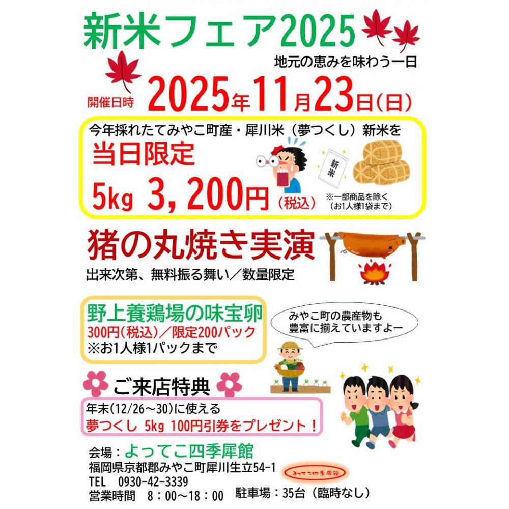 【みやこ町】11/23(日)新米フェア開催!夢つくし5kg3200円や猪の丸焼きなど盛りだくさん♪【よってこ四季犀館】
